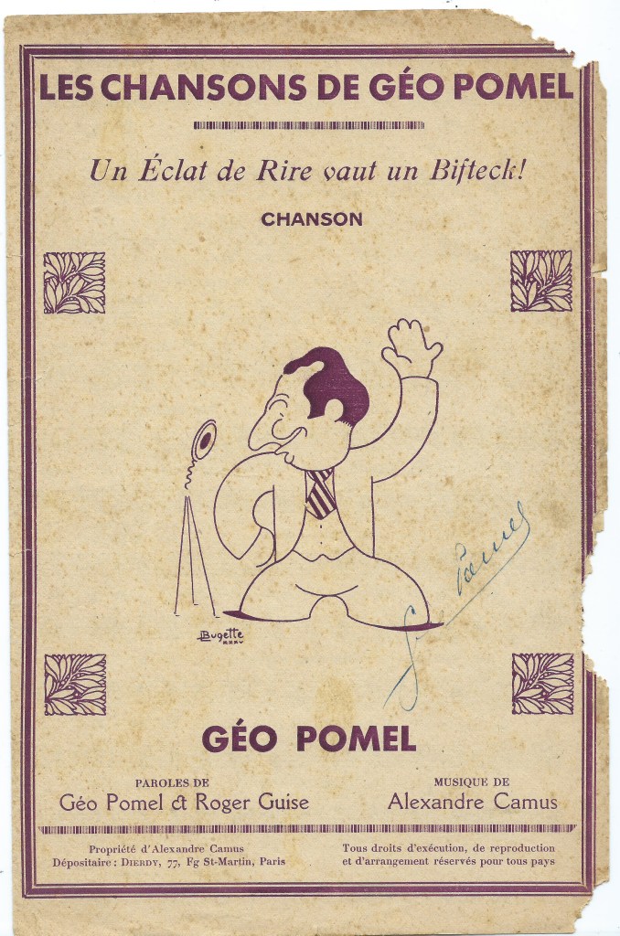 Chansonnier, actor and radio star Geo Pomel was a vaudeville comic in the great variety tradition. A favourite on the radio, in particular on Ondes Joyeuses de Radio-Paris. On the stage he appeared across Paris, including at L’Olympia, Concert Mayol, Theatre de Dix Heures, and Petit Casino.