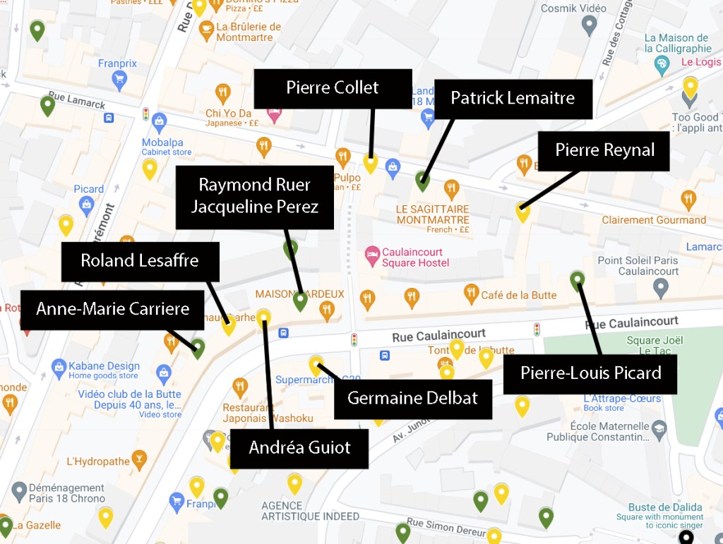 Actor Pierre Collet appeared in multiple episodes of the long running detective TV series Les cinq dernières minutes, just like his Montmartre neighbours Raymond Souplex and Patrick Lemaitre (who lived two doors away). Far from a one trick pony, his cinema career was just as impressive, with a career that stretched from 1943 to 1976. He was also the first French voice of Scooby-Doo. Scooby dooby doo!!!!
