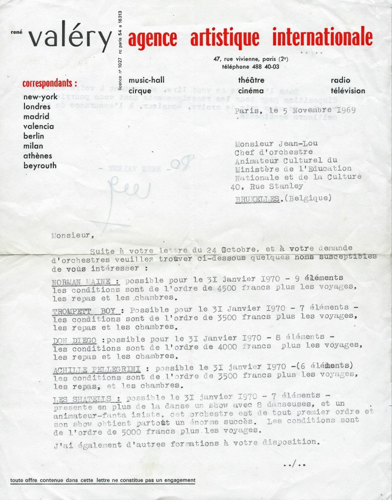The orchestra of bandleader Norman Maine (real name André Lucien Robert Cazenabe) released a number of recordings with popular singers in the 1950s and 60s, these included Arlette Zola, Harold Nicholas, Miguel Cordoba, and fellow Montmartre residents Miguel Amador and Gérard Laviny. His instrumental releases reflected the sounds of the mid-century dance floor, with twist, cha-cha, madison, and Latin grooves.