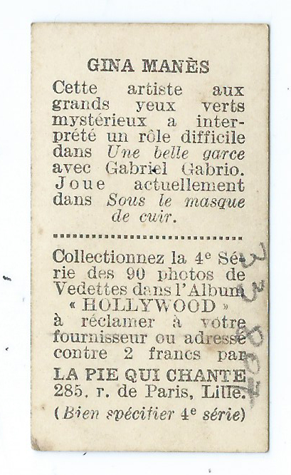 Gina Manès began her career in Parisian variety shows before making her film debut in The Man Without a Face (1919), directed by Louis Feuillade. She then worked under the directors René Navarre and Jean Epstein, and rose to become one of the leading French screen stars over the course of the 1920s. She reached the peak of her popularity in 1927 as Joséphine de Beauharnais in Abel Gance’s film Napoleon. At the height of her fame, Gina Manès left France with her husband, actor Georges Charlia, to run a canteen and later an acting school in Morocco. She developed a tiger training act which she presented at the Cirque d’Hiver and Medrano Circus, but in 1942 one of the wild animals seriously injured her. Manès continued to act in films, though in lesser roles. Her last screen appearance was the heist movie Pas de panique in 1966. She died in 1989 and donated her body to science.