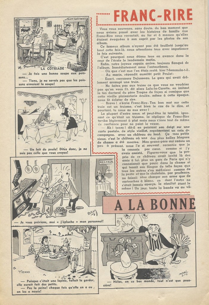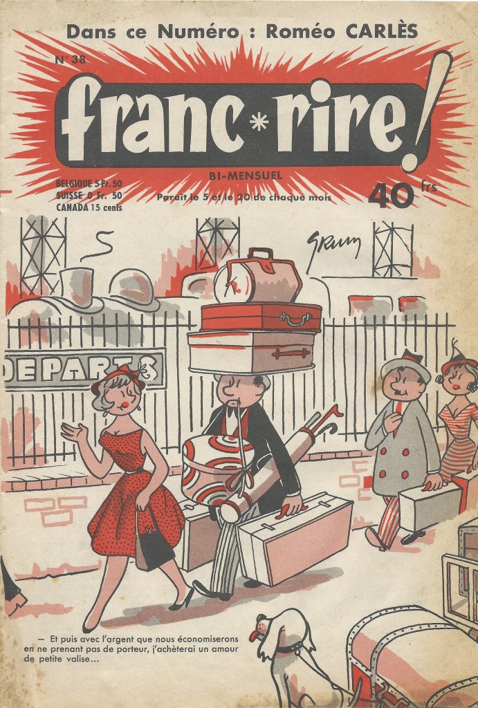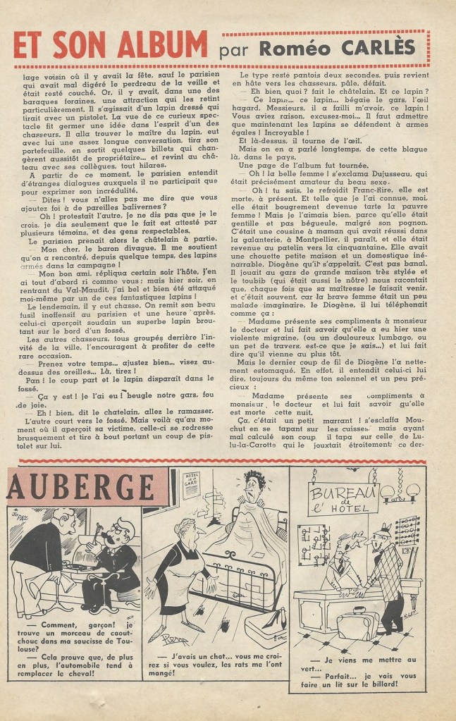 Algerian comedian Roméo Carlès was one of the great chansonniers on the Parisian scene, proving that you didn’t need to be a Montmartrois to rise to the top. He started at a young age, touring France with his father, an artisan blacksmith who reinvented himself as a tenor. Young Carlès would make his debut as an 8 years old on the stage of the Trianon-Lyrique, the famous venue in Paris’ 18th arrondissement. He dreamt of becoming a painter but the lure of capital’s cabarets was too strong. He would go on to be a regular performer on the stages of the Coucou, Dix Heures, Caveau de la Republic, Lune Rousse, and the Chat Noir, where he first appeared in 1920. He was a popular radio star and appeared in a number of films during a 30 year cinema career (1933-1964). He wrote and published his jokes in the comic books Blagues and Franc-Rire during the 1950s and 60s.