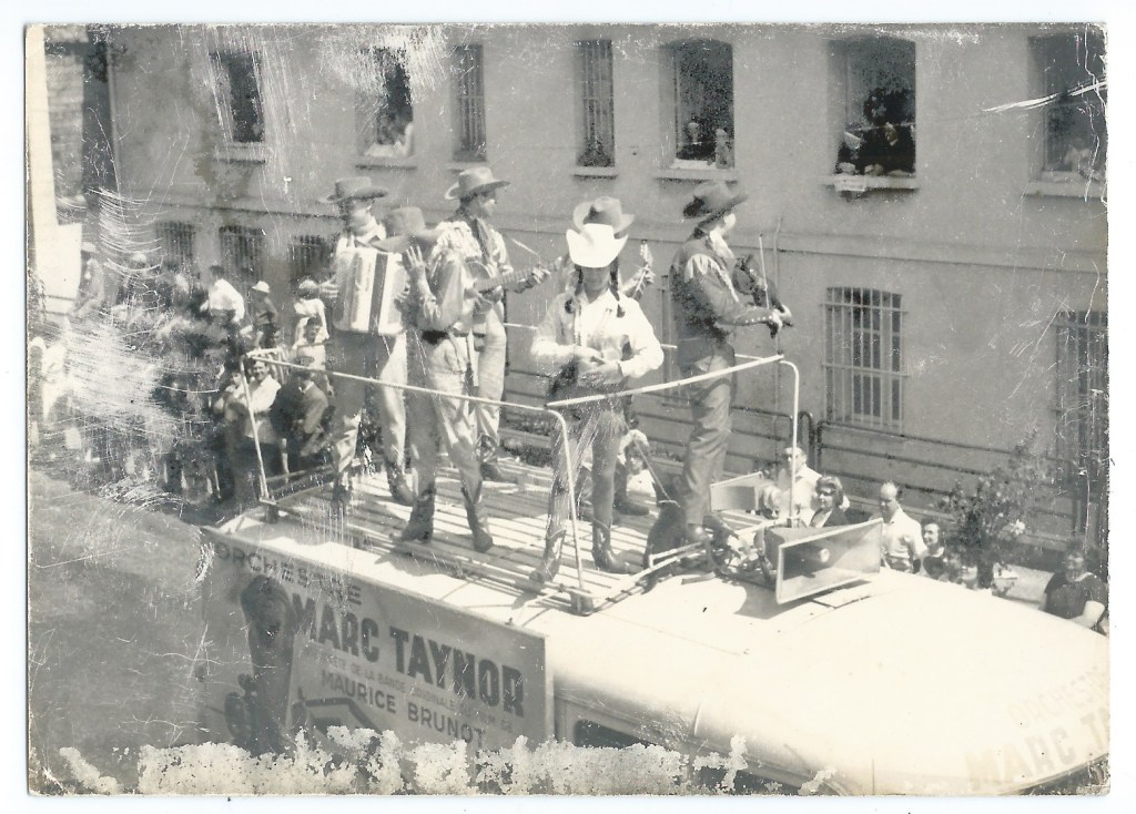 There weren’t many Hillbilly orchestras operating in France during the 1950s and 60s, so the cowboy outfit fronted by Wild West bandleader Marc Taynor was one of the more memorable (if not incongruous) footnotes in Paris’ musical history. Every cowboy needs a sidekick and riding alongside Taylor was the pigtailed Basque singer Elise Rubio aka ‘La Bombe’, known by her stage name Alicia Ruby. Like his cowgirl partner, our cowboy Marc Taynor was not originally from the United States, in fact he was a proud Frenchman, Marcel Poincignon. As a writer and performer he rode many a popular novelty wave, cue such titles as Boing Boing (from the comedy film Comment réussir en amour, 1962) and Rugby Rock, no Frenchman could resist a combination of Rock n Roll and Rugby in the 1960s. Behind his many pseudonyms (Ben Azim, Ian Boutouk, Mister Sax) was a talented musician who played the violin, saxophone, clarinet, and was an equally accomplished songwriter. His musical journey started at the age of 6 after hearing Yehudi Menuhin play at the Salle Pleyel. As a teenager Poincignon worked as a musician on the Bordeaux-Panama and Le Havre-New York ocean liners. Back on dry land he led his own band at the cabarets La Coupole and Bacara, but as WW2 broke out he fought for the motherland. After a brave retreat at Dunkirk he moved from England to Africa, and ultimately returned home to work with trumpeter Philippe Brun. With the end of war and a love for all things American being on trend, he changed his name to Marc Taynor. He played with many of the top names in Paris at the time (Émile Prud’homme, Tony Murena, Gus Viseur and even the great Django Reinhardt) and his orchestra boasted the talents of even more Paris musicians: Marcel Azzola, Freddy Vander, Didi Duprat, Jack Irsa and André Salvador (Henri Salvador’s older brother).