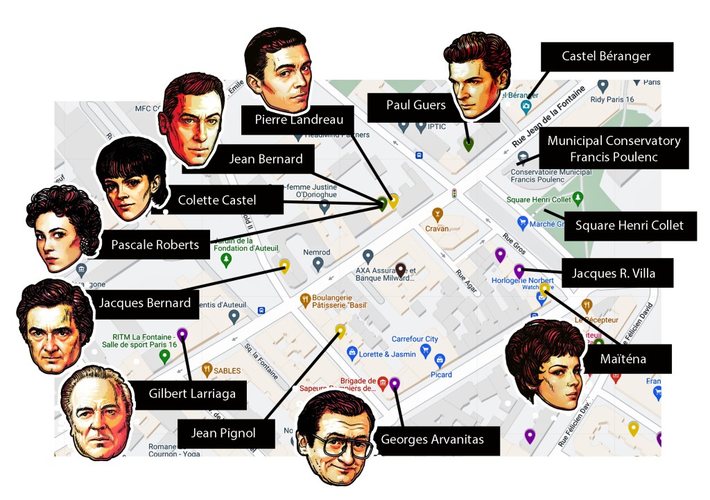Actor Paul Guers studied at the Conservatoire national supérieur d’art dramatique (class of 1953). He was a resident of the Comédie-Française from 1953 to 1956, and would continue to regularly appear on the stage until 1986. In the cinema he played the male lead in La Fille aux yeux d’or, alongside Marie Laforêt. The 1961 film was inspired by Honoré de Balzac’s 1835 short novel The Girl with the Golden Eyes. Balzac’s former home at 47, rue Raynouard is only just a short walk away. As Guers worked steadily during the 1970s and 80s his film work grew more sporadic and he would increasingly appear on TV, including the crime series The Octopus (1984-87). In 2016, he was found dead alongside his wife, the writer Marie-Josèphe Guers, at their home in Montsoreau. Paul Guers had been receiving cancer treatment at the time.
