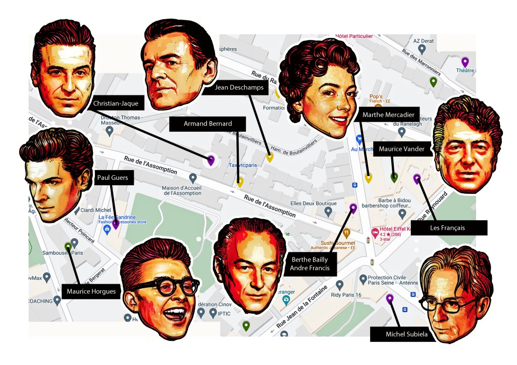 Actor Paul Guers studied at the Conservatoire national supérieur d’art dramatique (class of 1953). He was a resident of the Comédie-Française from 1953 to 1956, and would continue to regularly appear on the stage until 1986. In the cinema he played the male lead in La Fille aux yeux d’or, alongside Marie Laforêt. The 1961 film was inspired by Honoré de Balzac’s 1835 short novel The Girl with the Golden Eyes. Balzac’s former home at 47, rue Raynouard is only just a short walk away. As Guers worked steadily during the 1970s and 80s his film work grew more sporadic and he would increasingly appear on TV, including the crime series The Octopus (1984-87). In 2016, he was found dead alongside his wife, the writer Marie-Josèphe Guers, at their home in Montsoreau. Paul Guers had been receiving cancer treatment at the time.