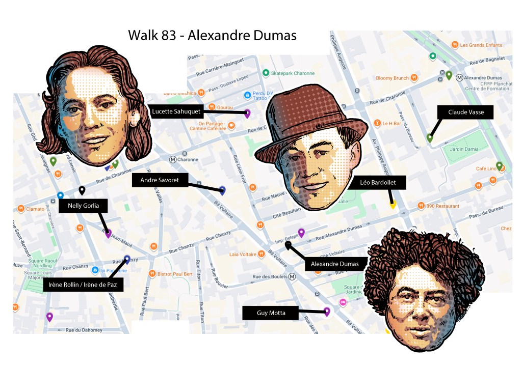 On the corner of Rue Alexandre Dumas and Boulevard Voltaire look up and you’ll see the magnificent bust of Alexandre Dumas towering over you. A prolific writer, Dumas first wrote successful vaudeville and historical dramas but turned to historical novels, achieving considerable success with his classic musketeer trilogy Les Trois Mousquetaires (1844-1850) and Le Comte de Monte-Cristo (1844-1846).