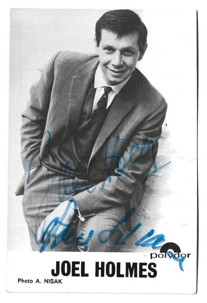Originally from Bessarabia, then part of Romania, Joël Holmes immigrated to France with his family in 1934. He was orphaned during WW2 when his parents were deported to Auschwitz, he was just 14 years old. To make ends meet he worked several jobs (electrician, salesman, photographer, etc.) before taking acting classes and beginning his singing career. Holmes sang in various Parisian cabarets but it was his victory on the show Numéros 1 de demain, organised by the radio station Europe 1, that gave him his first recording contract in 1959. Although he won the Grand Prix of the Charles-Cros Academy in the 1960s, he gave up singing before the end of the decade.